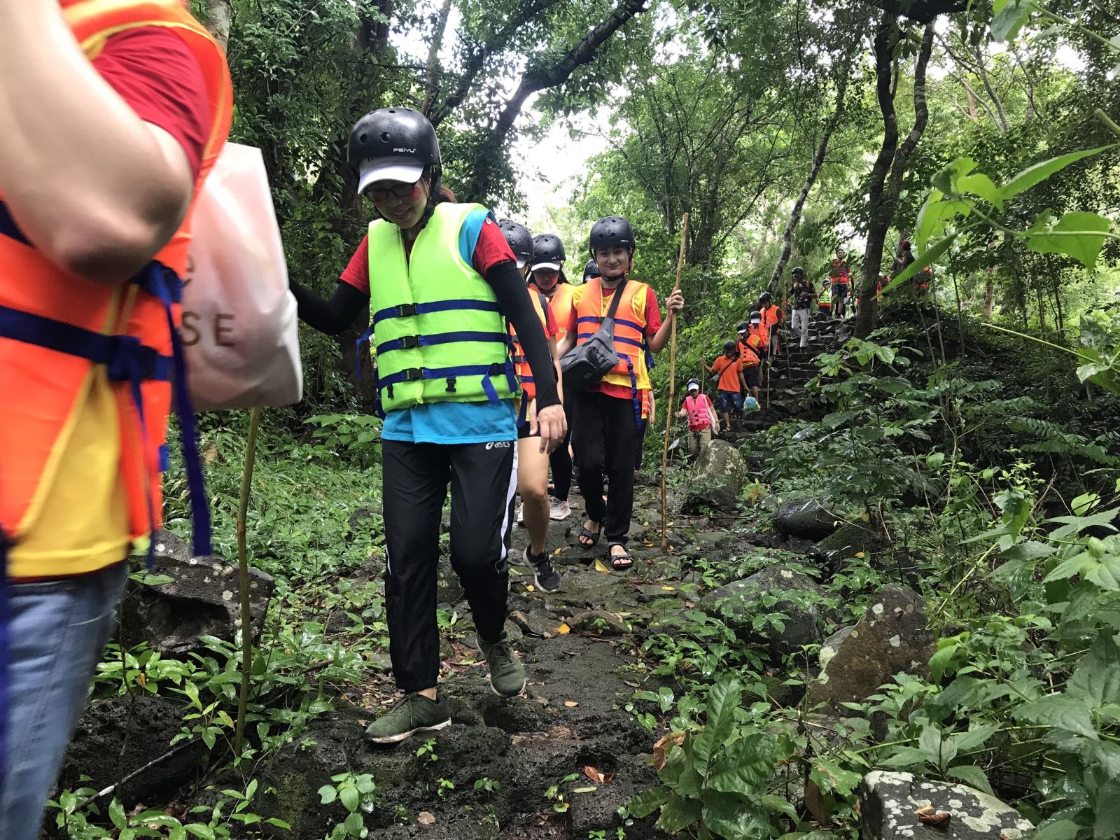 10:15 Nhận áo phao và gậy đi bộ để bắt đầu chuyến trekking dài 500m men theo những phiến đá cổ xưa dọc sông Serepok